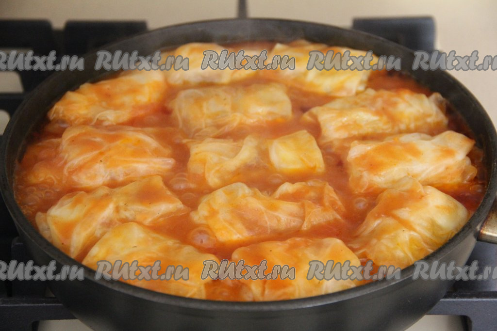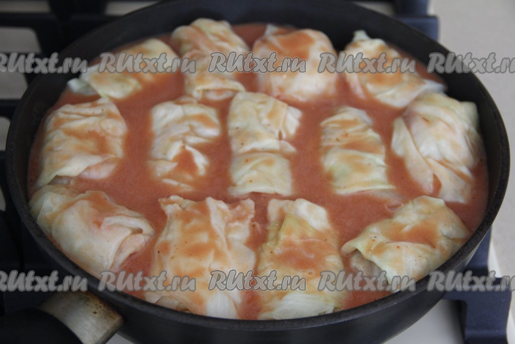 Влить в сковороду с голубцами получившийся томатный соус, поставить на огонь. Как только соус закипит, накрыть сковороду крышкой и убавить огонь до минимума. Томить голубцы минут 30.