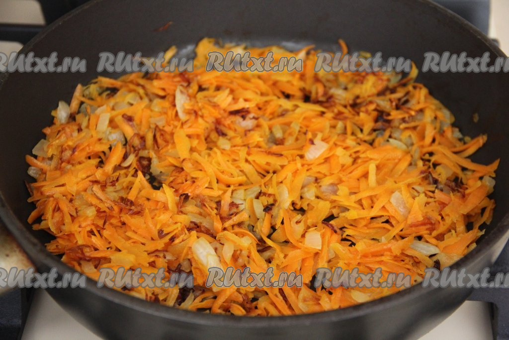 Выложить к обжаренному луку морковку, натёртую на крупной тёрке, перемешать и обжаривать овощи минут 7 (до мягкости моркови), не забывая их периодически помешивать, затем выключить огонь.