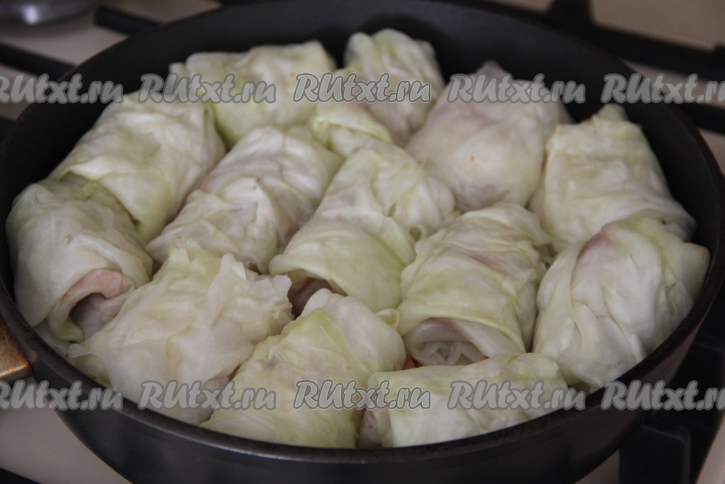 Поверх обжаренных овощей выложить голубцы. Я использовала большую сковороду диаметром 28 сантиметров.