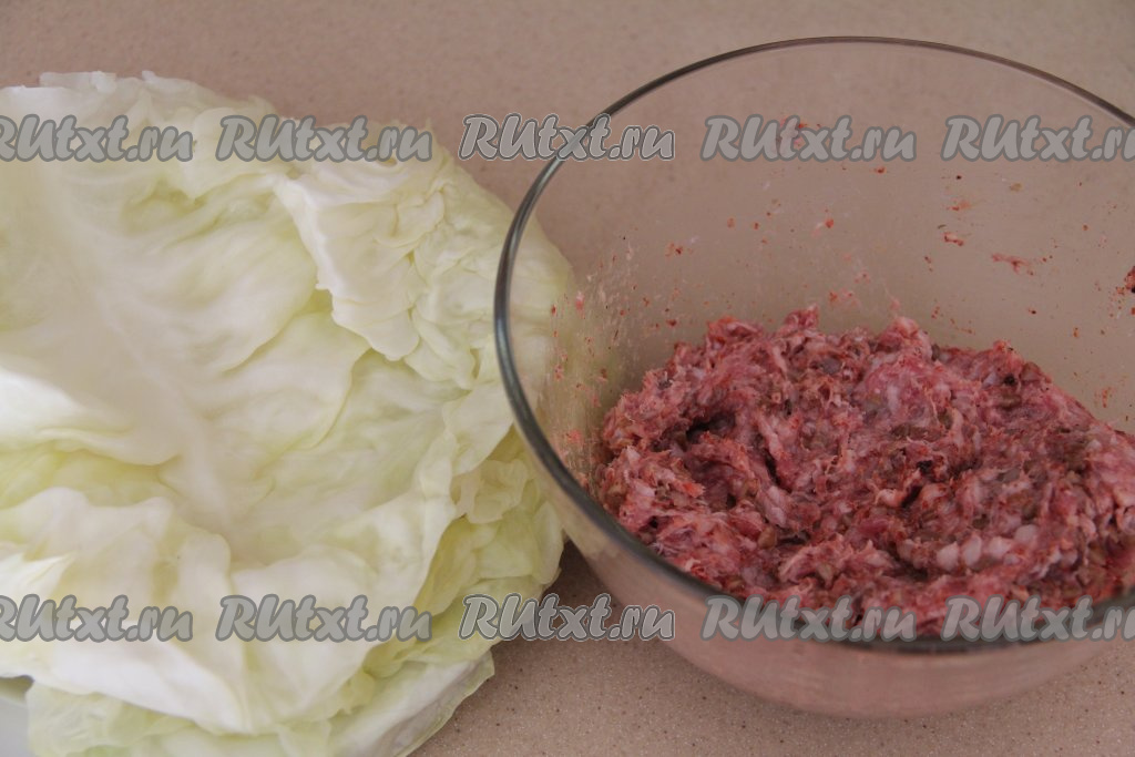 Из кочана капусты вырезать кочерыжку. Для того чтобы листья были эластичными, их можно размягчить в микроволновке или в кастрюле. Я размягчила в микроволновке, для этого нужно завернуть кочан в пищевую плёнку и отправить в микроволновку минут на 8-10 при максимальной мощности, затем развернуть плёнку и снять размягчившиеся листья (в этот раз у меня листья капусты стали мягкими за 10 минут, но многое зависит от сорта капусты). У меня капустные листья были крупными, поэтому я взяла с кочана 7 листьев, а затем разрезала листья по середине (вдоль утолщенной части), в результате я сформировала 13 голубцов. Если листочки у капусты небольшие, можно взять и 13 листьев для формирования голубцов. Если не хотите размягчать листья в микроволновке, тогда можно поместить кочан в кастрюлю, залить его полностью водой, поставить на огонь, после закипания на небольшом огне проварить 4-5 минут, достать кочан, аккуратно отделить мягкие листья, затем кочан с оставшимися листочками снова поместить в эту же кастрюлю и продолжать варить ещё несколько минут (до мягкости листьев). Дать листьям остыть.