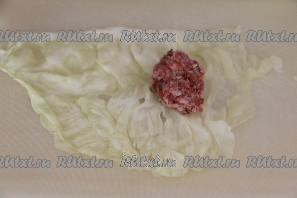 Теперь можно приступать к формированию голубцов, для этого нужно взять лист капусты, у основания листа выложить часть начинки из фарша и гречки, а затем завернуть её в капустный лист конвертиком (то есть накрыть вначале начинку ближайшей частью листа, после этого подвернуть на начинку длинные боковые края листа и свернуть лист рулетиком, начиная с края с начинкой). У меня получилось 13 голубцов среднего размера.