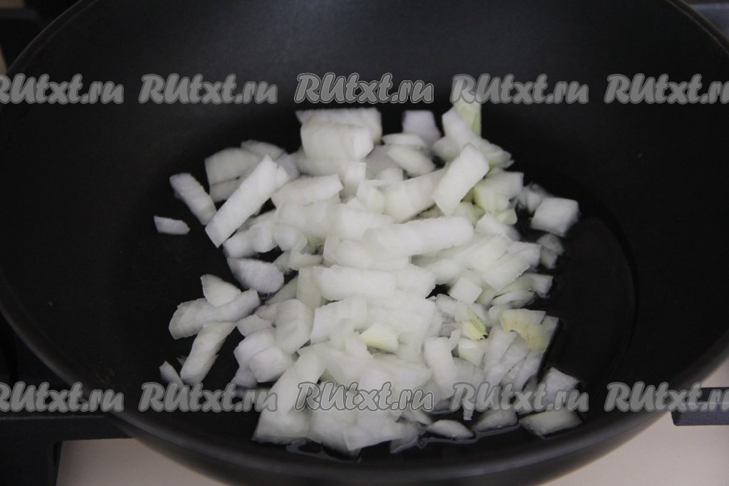Лук и морковь очистить. Нарезать мелко лук, выложить его в сковороду, влить немного растительного масла. Обжарить лук, помешивая, минуты 2-3 на среднем огне.