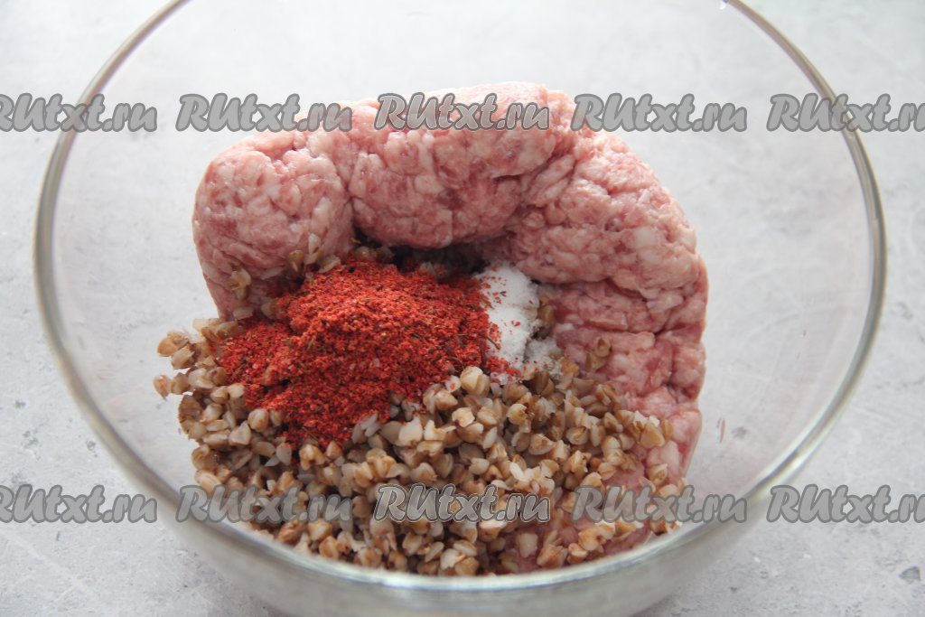В начинке для голубцов используется варёная гречка, поэтому прежде всего нужно перебрать крупу, промыть водой, выложить в кипящую, слегка подсоленную воду (соотношение воды и гречки должно быть 2 к 1, то есть воды должно быть в 2 раза больше, чем крупы) и после повторного закипания воды варить на небольшом огне до готовности (в течение 20-25 минут). Дать готовой гречневой каше остыть. Можно взять и гречневую кашу, оставшуюся с обеда или ужина. Для приготовления голубцов понадобится примерно грамм 120-150 варёной гречки. В объёмной миске соединить мясной фарш, сваренную гречку, соль и специи (я использовала паприку). Тщательно вымесить фарш и начинка для голубцов готова.