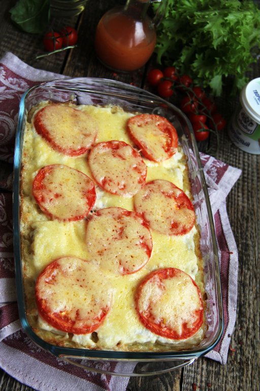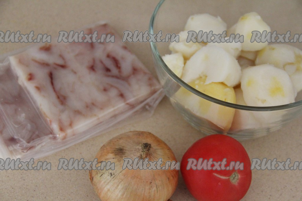 Картошку почистить, крупные клубни разрезать на несколько частей. Переложить картошины в кастрюлю, полностью залить водой, поставить на огонь. После закипания подсолить воду, уменьшить огонь и отварить картофель до готовности (готовые картошины будут легко прокалываться ножом, на варку с момента закипания потребуется минут 20-25), затем слить воду. Помидоры вымыть, лук почистить. Для приготовления запеканки я купила прессованное рыбное филе, его нужно только разморозить. Можно взять и целую тушку рыбы, разморозить её, удалить хребет с костями, голову, плавники, внутренности, затем промыть и нарезать получившееся филе на небольшие кусочки.