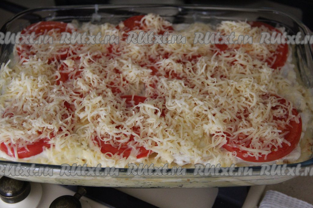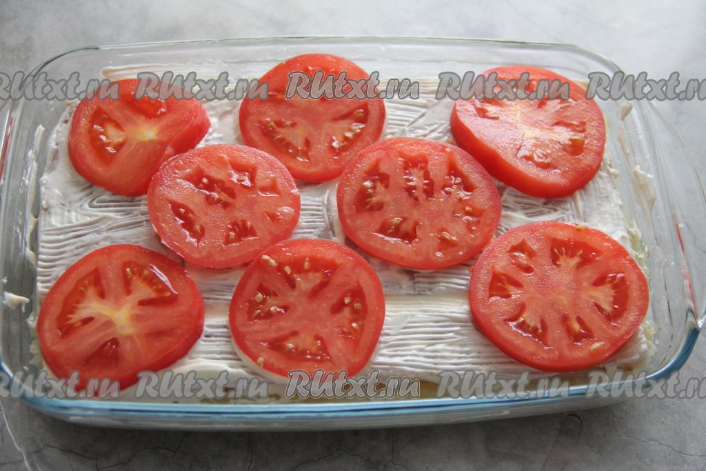 Помидоры нарезать на кружочки и выложить поверх рыбы.