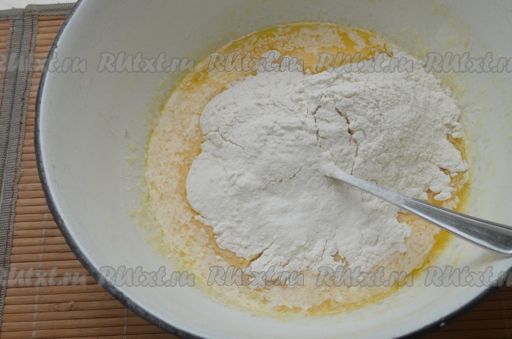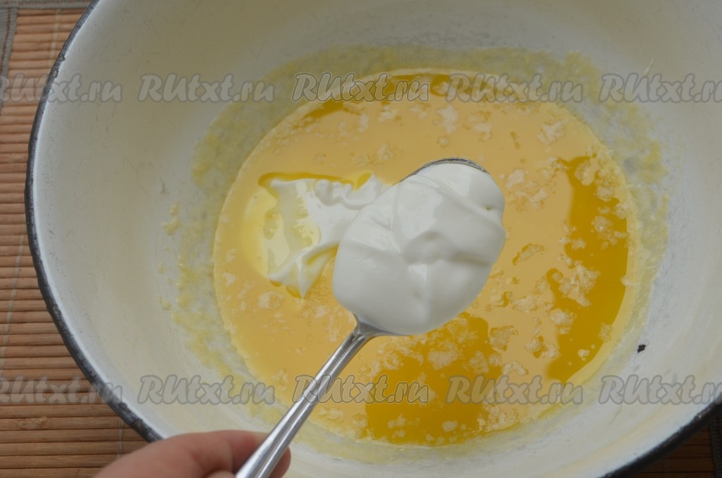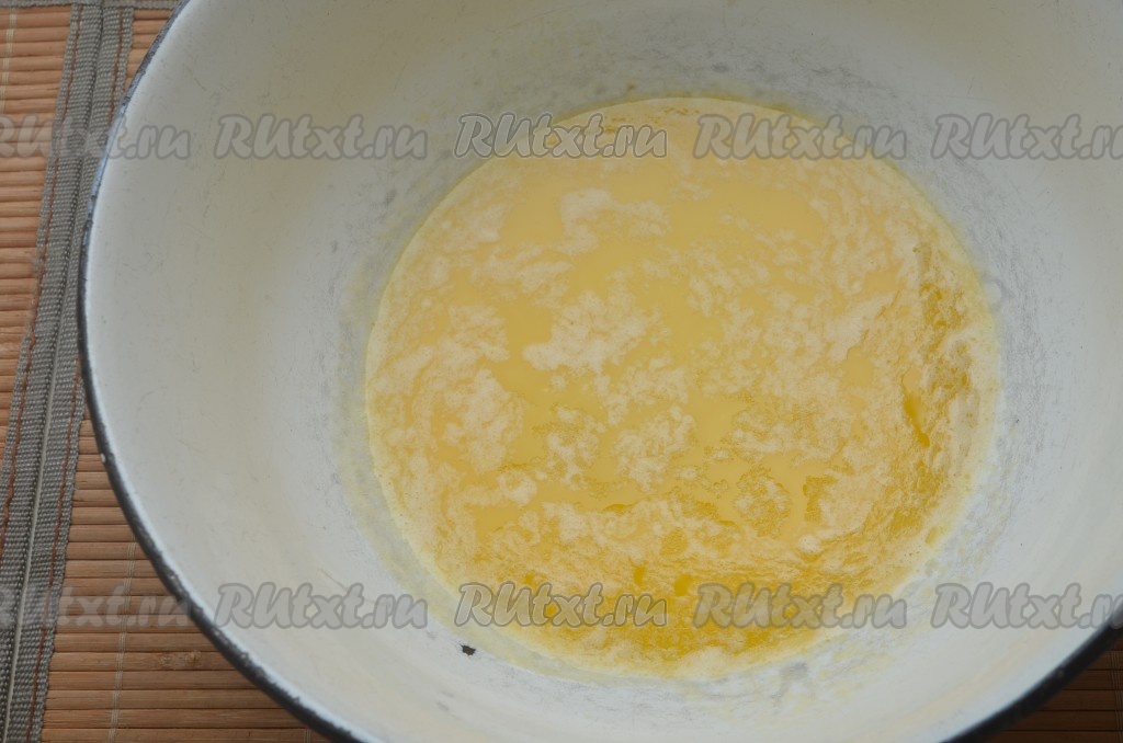 Вначале замесим тесто, для этого прежде всего нужно сливочное масло растопить (я растопила в микроволновке), остудить и перелить в миску, в которой будете замешивать тесто.