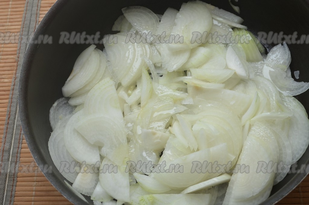Для приготовления начинки для этого песочного пирога нужно очистить репчатый лук, нарезать полукольцами, обжарить на растительном масле до золотистого цвета на среднем огне, не забывая помешивать время от времени, посолить и поперчить по вкусу. Снять с огня и дать остыть.