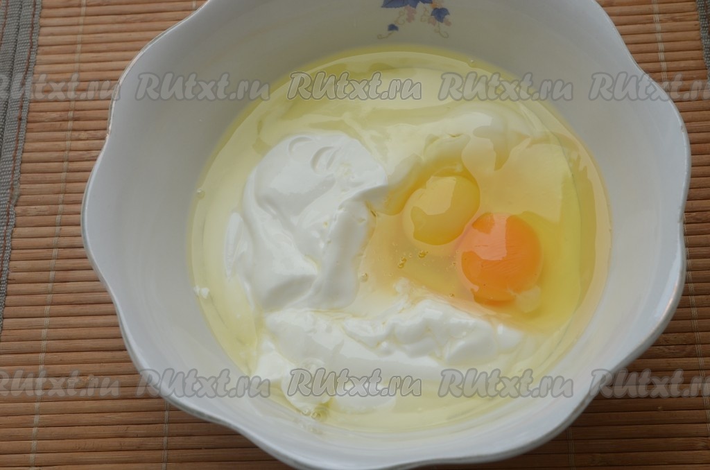 250 грамм сметаны и 2 яйца соединить в глубокой тарелке и тщательно перемешать.