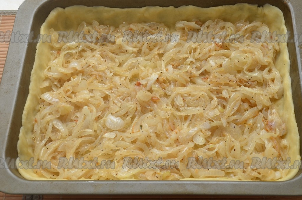 Обжаренный остывший лук равномерно разложить поверх теста.
