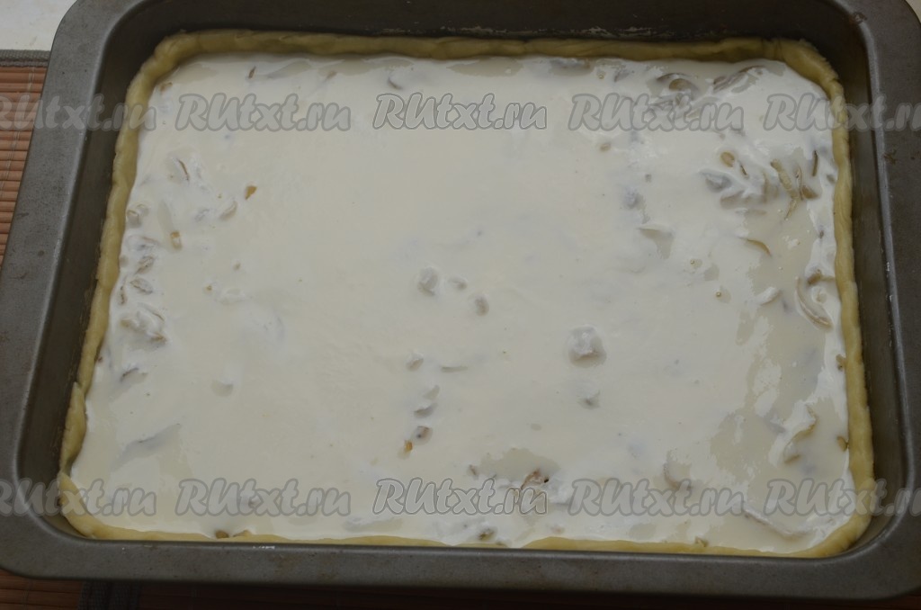 Распределить тесто руками по форме, формируя бортики. Форму смазывать не надо, готовый пирог к форме не пристаёт.