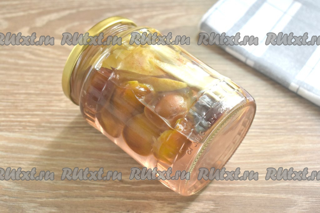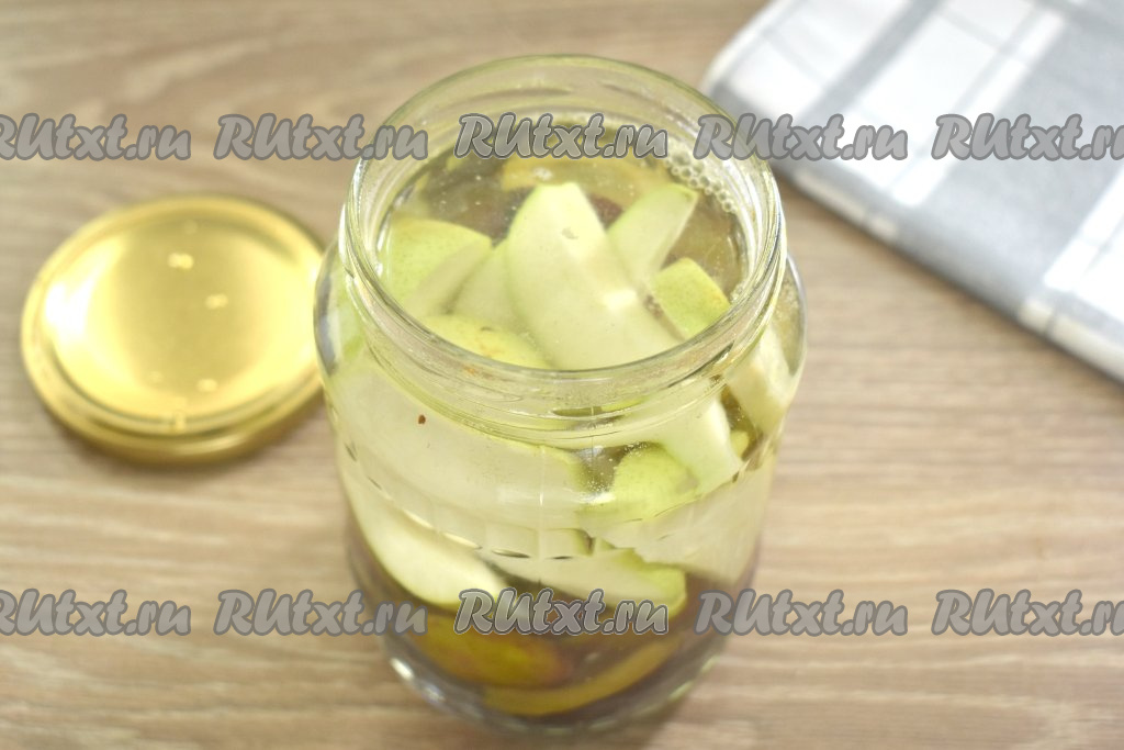 Вливаем горячий сироп в банку с грушами и сливами, сразу закручиваем (или закатываем) банку крышкой. Банку с компотом ставим вверх дном, укрываем её пледом (или тёплым полотенцем, или одеялом) и оставляем до полного остывания (обычно на это уходят сутки), а затем можно убирать на хранение. Такой компот можно хранить в условиях квартиры.