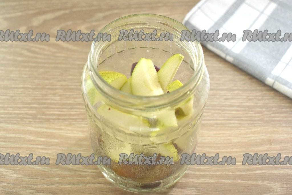 Половинки слив и ломтики груш перекладываем в подготовленную банку.