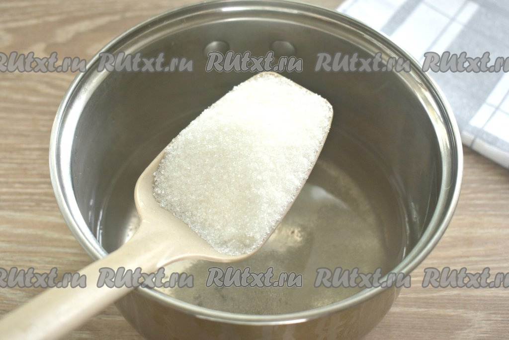 В воду, которую мы слили из банки, всыпаем сахар, перемешиваем, ставим на огонь, после закипания провариваем сироп на небольшом огне минуты 2-3.