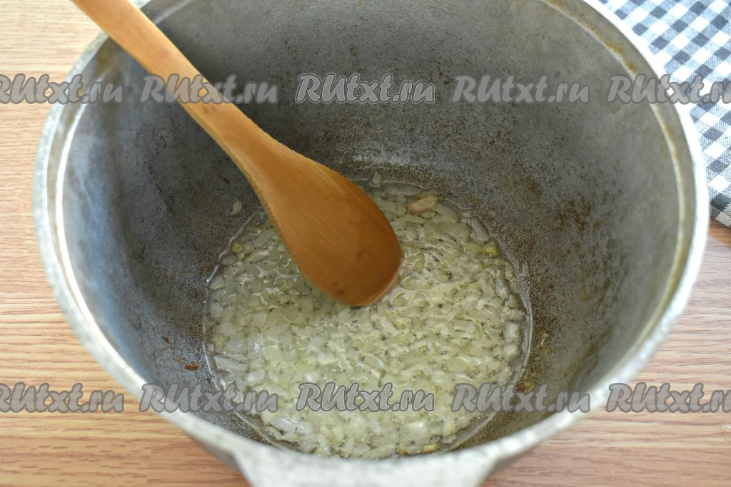 Я готовила гуляш в казане, можно использовать также глубокую сковороду или кастрюлю с толстым дном. Вливаем в казан (или в кастрюлю, или в сковороду) растительное масло, разогреваем, затем выкладываем нарезанный лук и, периодически перемешивая, обжариваем его 3 минуты.