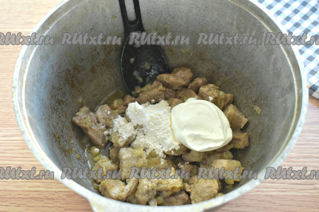 Затем к обжаренным кусочкам свинины добавляем муку и сметану, перемешиваем.