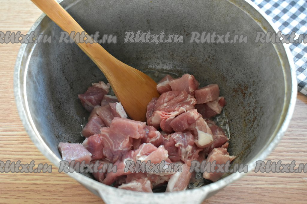 Свинину промываем, обсушиваем и нарезаем на кубики со сторонами примерно 2 сантиметра. Подготовленное мясо выкладываем к обжаренному луку, перемешиваем.