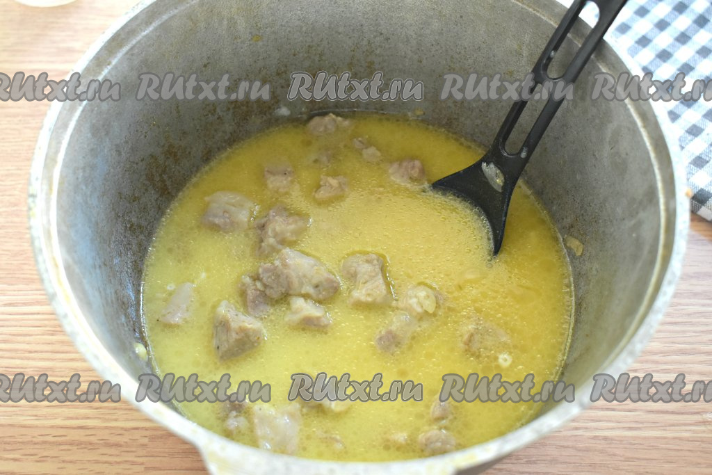 Тушим гуляш в сметанном соусе 25-30 минут (до мягкости свинины).