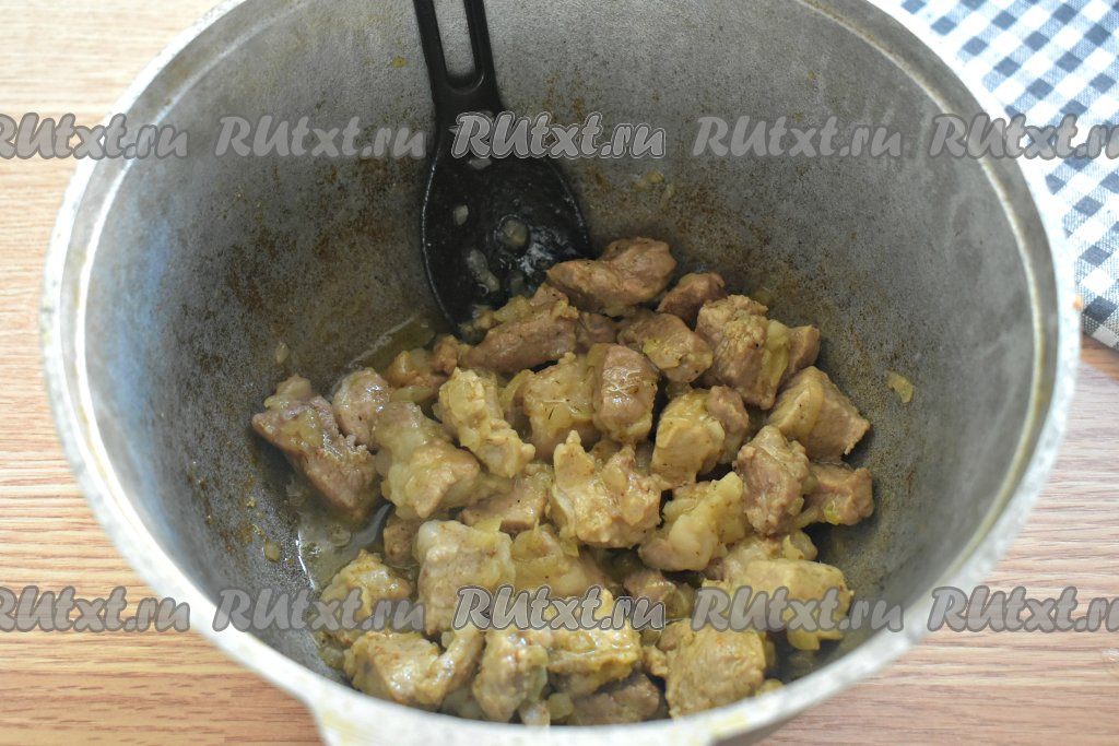 Обжариваем свинину с луком на огне чуть выше среднего, иногда перемешивая, примерно 10-15 минут.