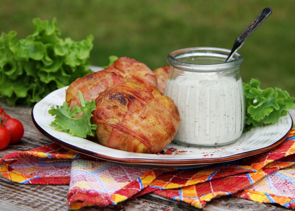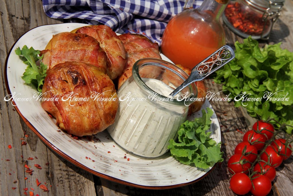 Готовую картошку в беконе снять с мангала, переложить с решётки на тарелку и подать к столу в горячем виде вместе с любимым соусом.