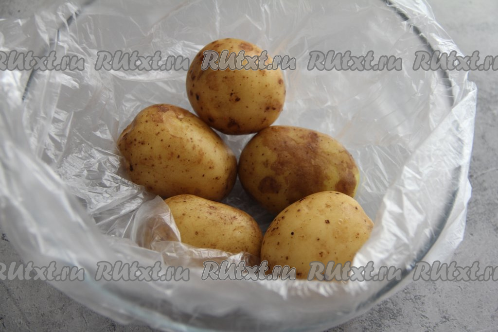 Подготовленные картошины выложить в пакет, завязать, сделать несколько проколов зубочисткой на поверхности пакета. Поместить картошку в микроволновку и готовить 8-10 минут при максимальной мощности. Картошка должна стать полностью готовой. Для того чтобы проверить готовность, просто проколите картофелину зубочисткой (прокалывать можно через пакет), если зубочистка легко входит в картошку, значит она готова. Если же зубочистка входит в картошину с трудом, значит продолжайте запекать в микроволновке до готовности.