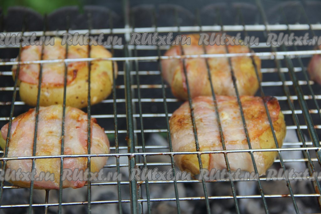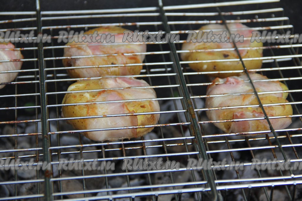 Жарить картофель минут 10, используя только жар углей. Во время жарки решётку нужно часто переворачивать, чтобы картошка равномерно запеклась в беконе.
