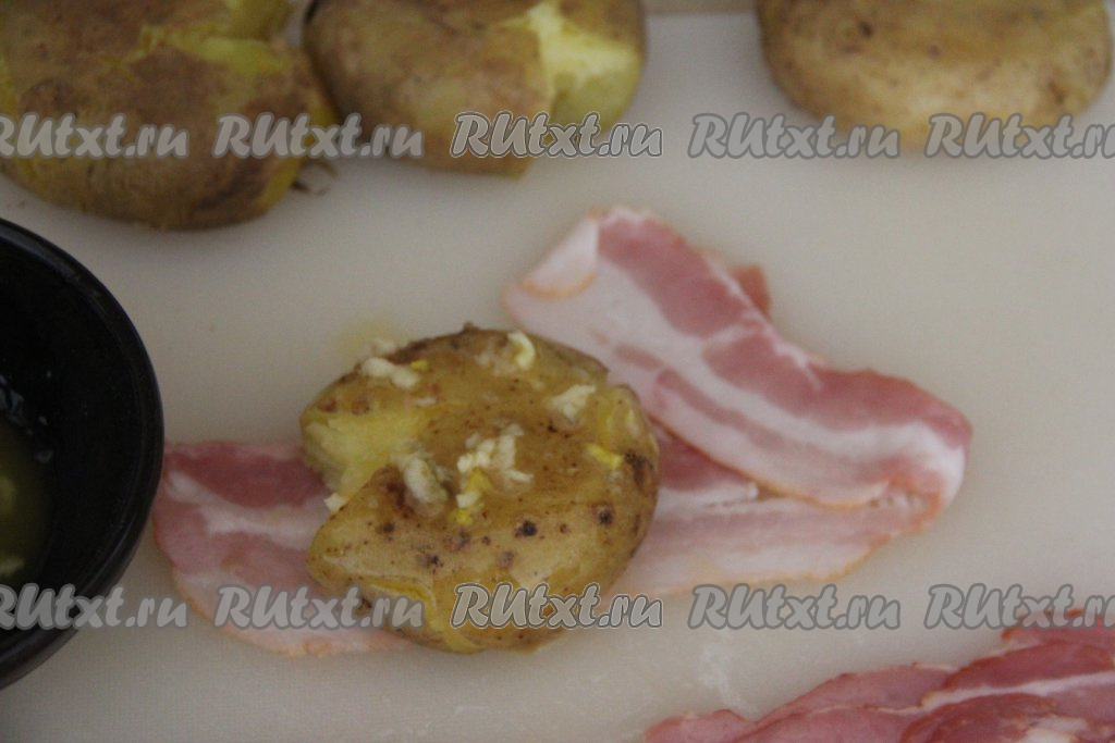 Выложить картошину на полоску бекона. Смазать картофель приготовленным пряным маслом.