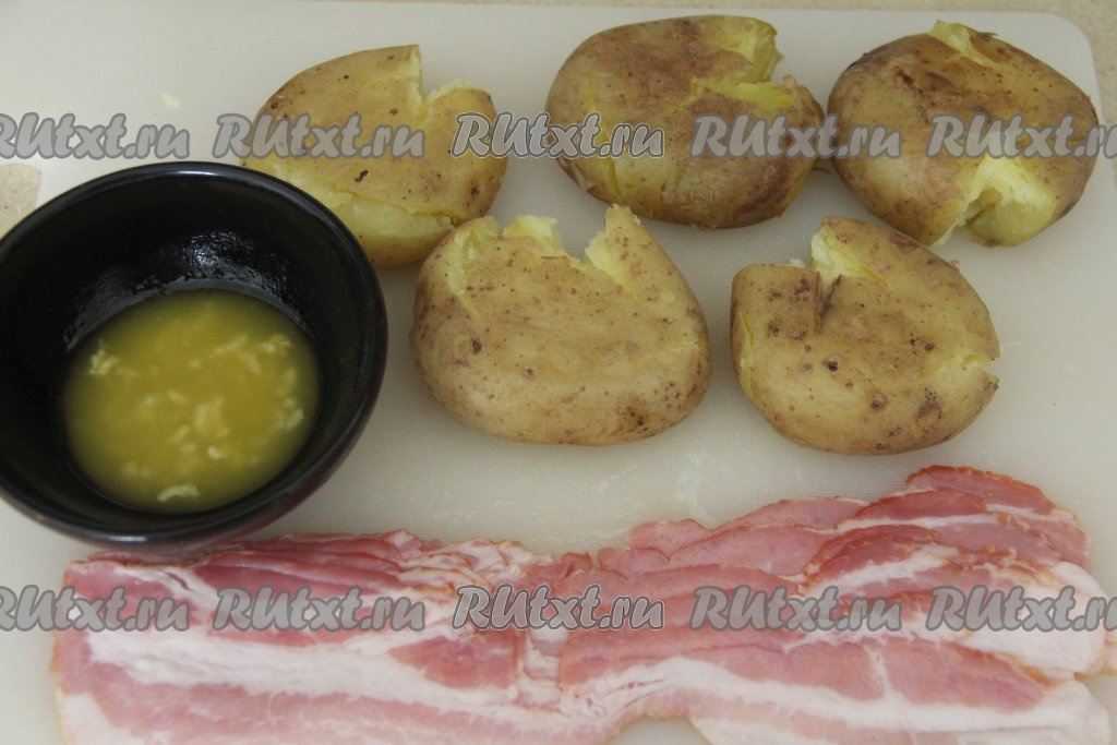 Завернуть картошину в полоску бекона. Аналогично смазать пряным маслом и завернуть в полоски бекона все картошины.