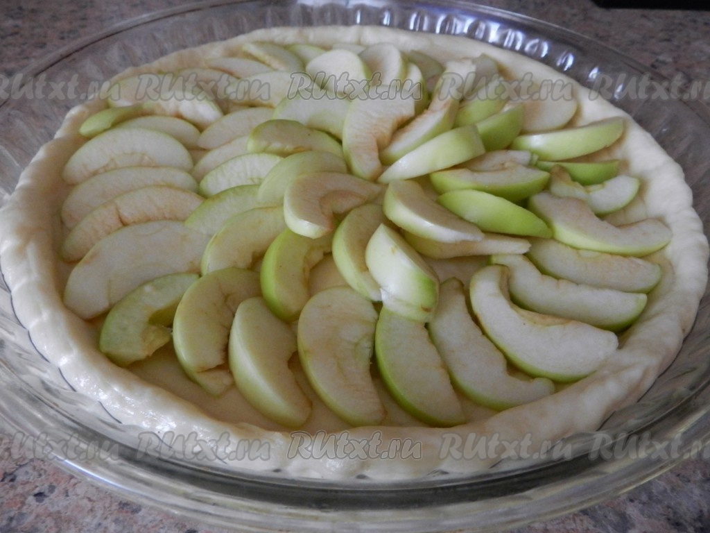 На тесто выложить нарезанные дольками яблоки, присыпать сахаром.