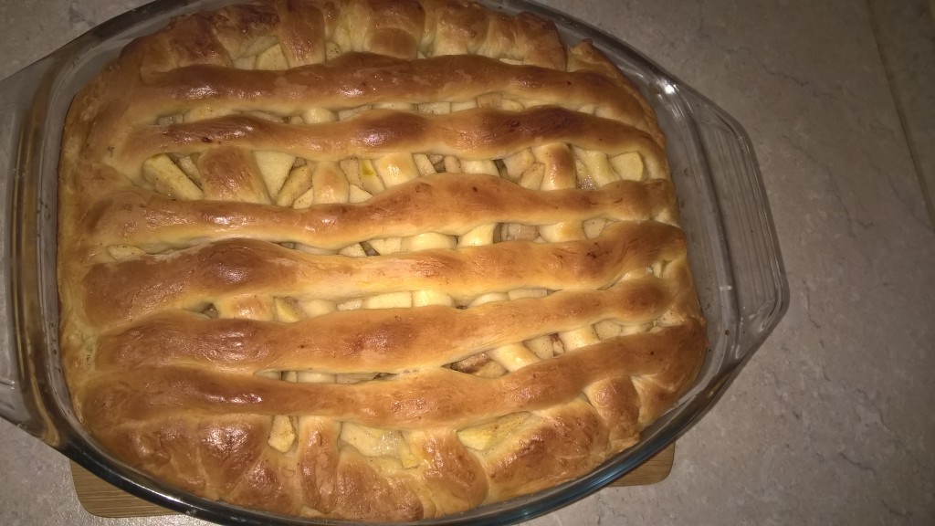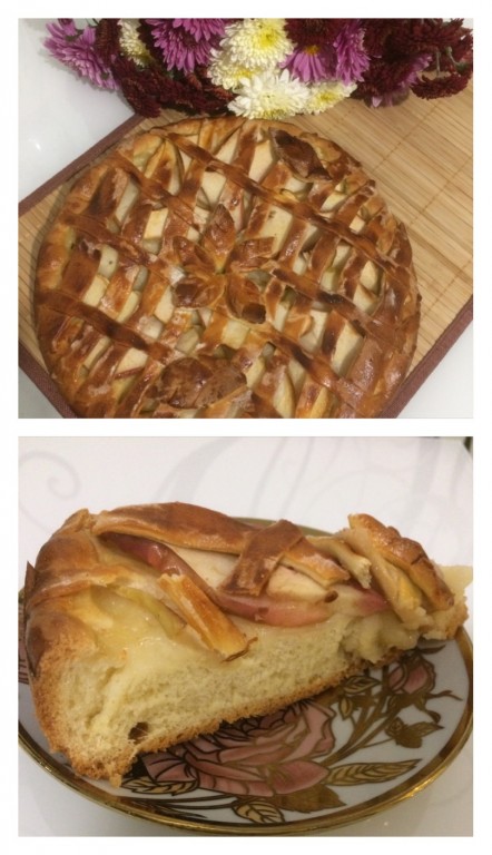Подошедшее тесто увеличится в объеме в два раза. Тесто готово для выпечки. Из него можно приготовить дрожжевые булочки, пирожки с любой начинкой. Я испекла один пирог с яблоками.
