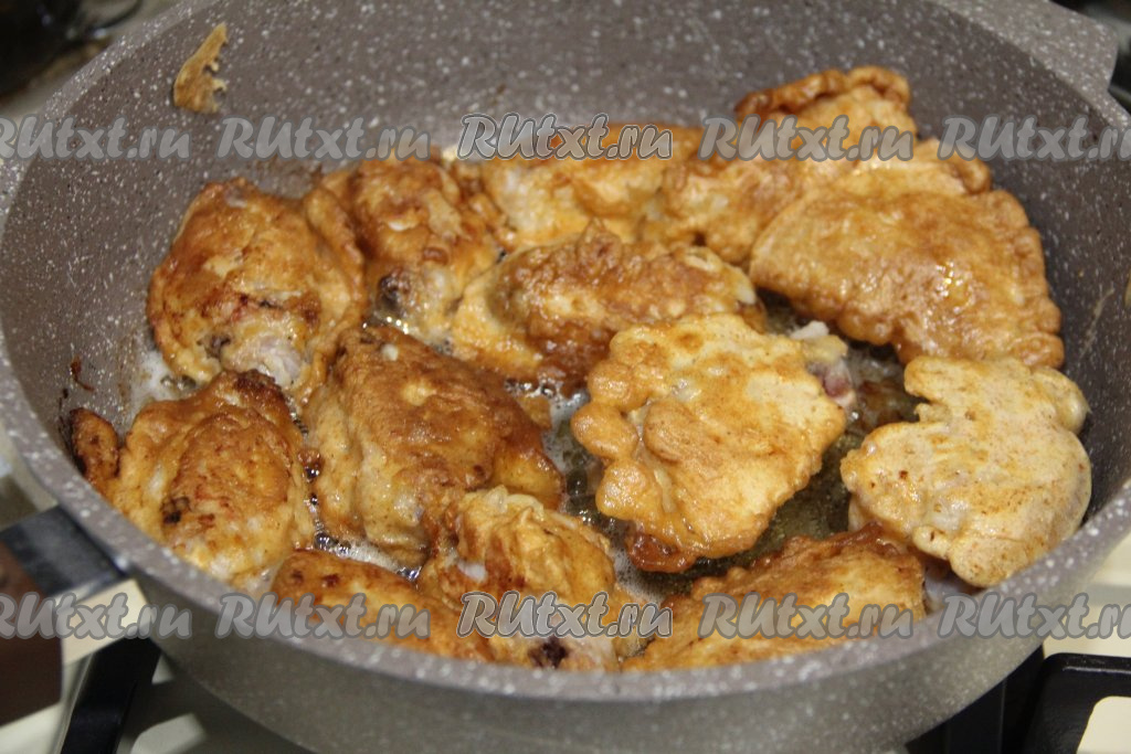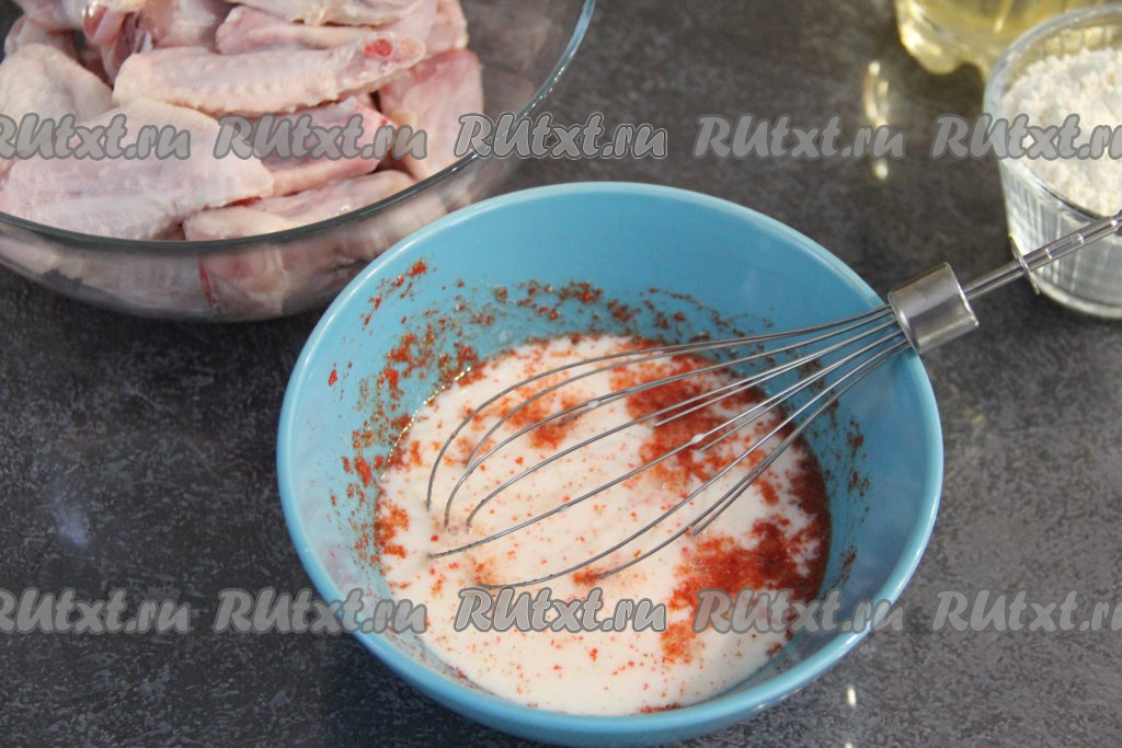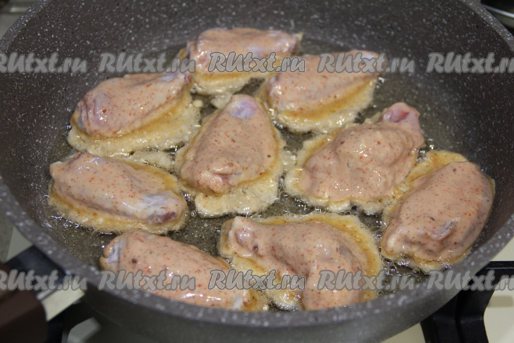 Сразу хорошо разогреть сковороду с растительным маслом. Обмакнуть вначале одно крыло в кляр со всех сторон. Кляр должен полностью покрыть крыло. Крылышко, покрытое кляром, сразу выкладывать на сковороду.