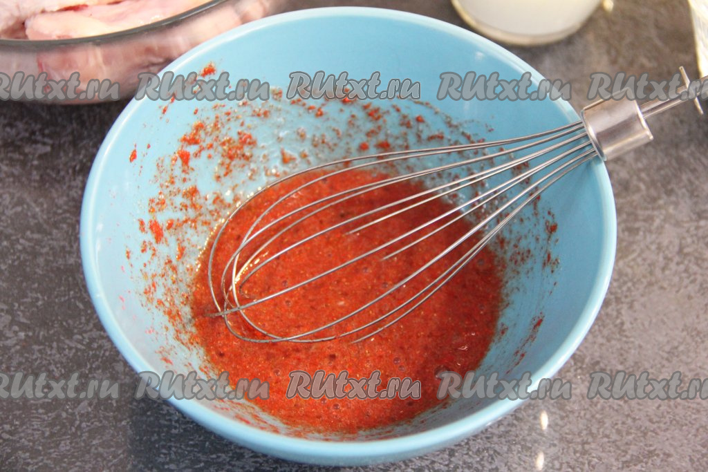 Для получения кляра в глубокой миске соединить яйца, соль, паприку, карри (или другие специи по вкусу), перемешать венчиком.
