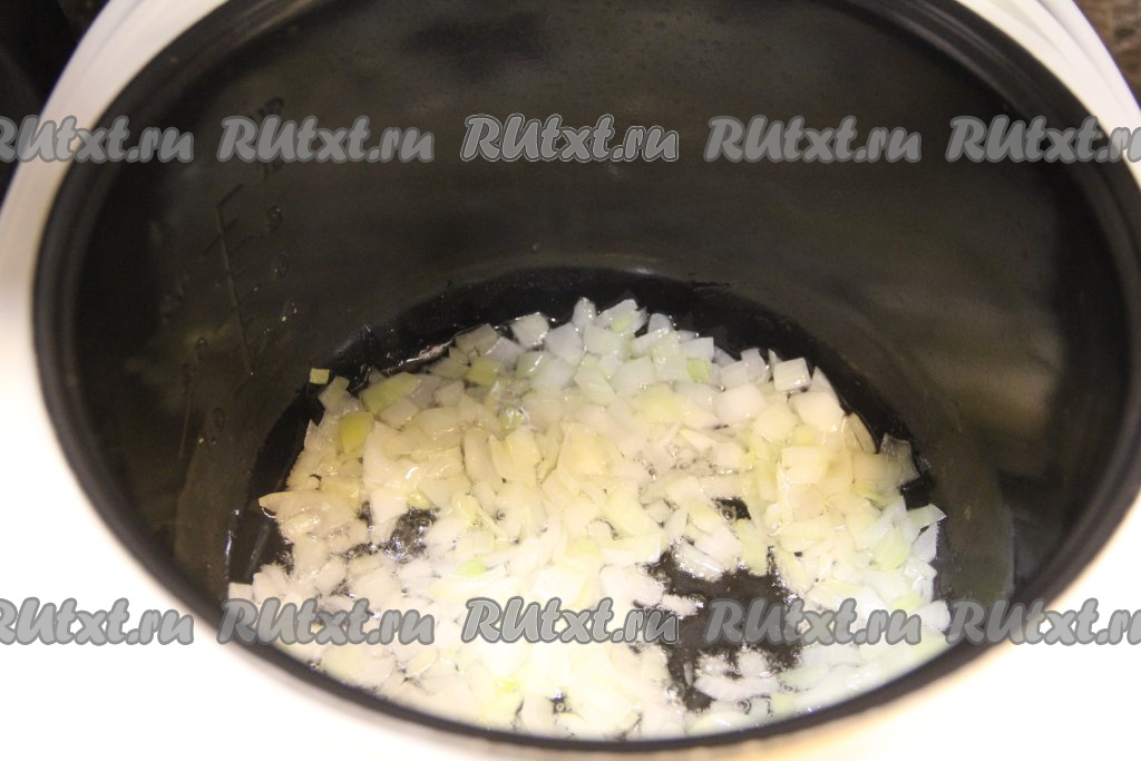 Почистить лук и морковь. В чашу мультиварки влить немного растительного масла, выставить режим "Жарка". Выложить в чашу мультиварки мелко нарезанный лук и обжарить его в течение 5 минут, периодически перемешивая и не закрывая крышку мультиварки.