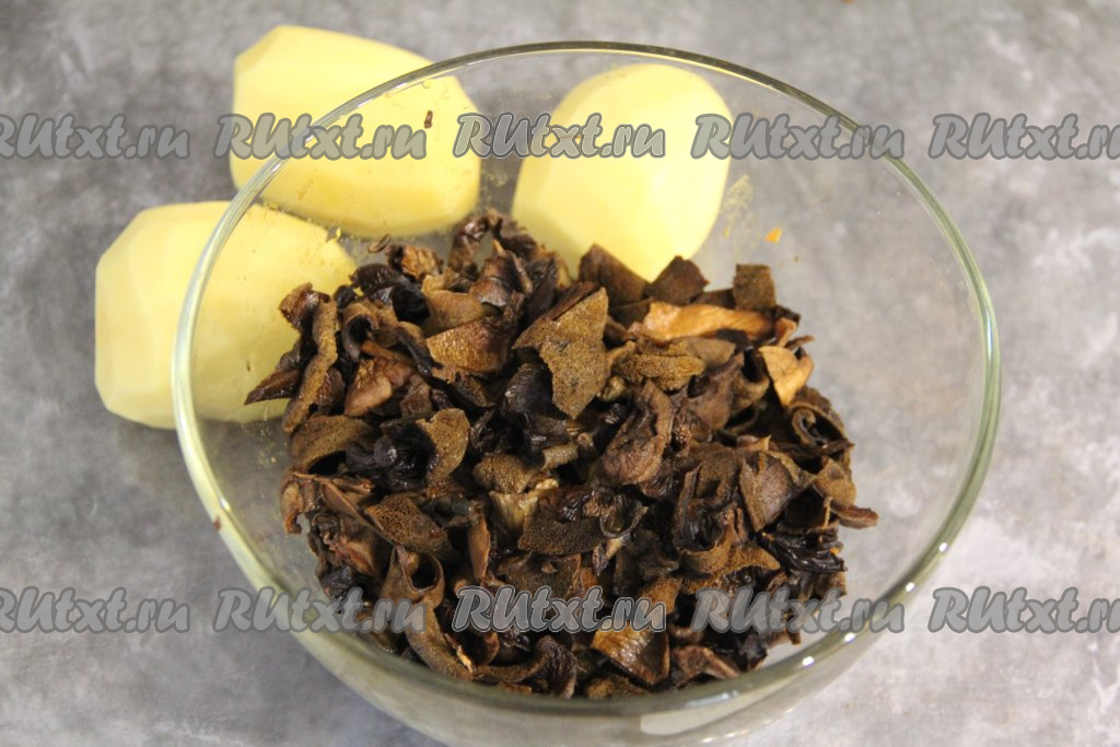 После того как сушёные грибы полежат в кипятке 15-20 минут, откинуть их на дуршлаг. Нарезать грибы на средние кусочки (или полоски) с помощью ножниц. Картошку очистить.