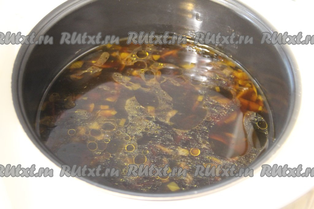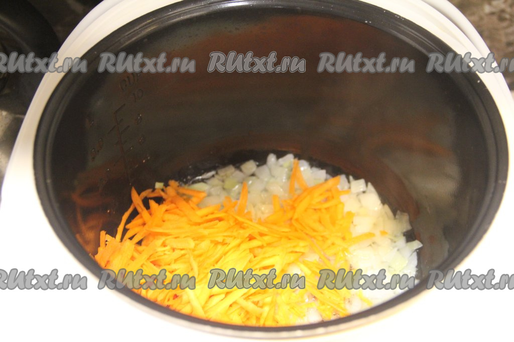 В чашу мультиварки с обжаренным луком добавить морковку, натёртую на крупной тёрке. Обжаривать овощи, не закрывая крышку мультиварки, минут 5 (морковь должна стать мягкой), не забывая иногда помешивать.