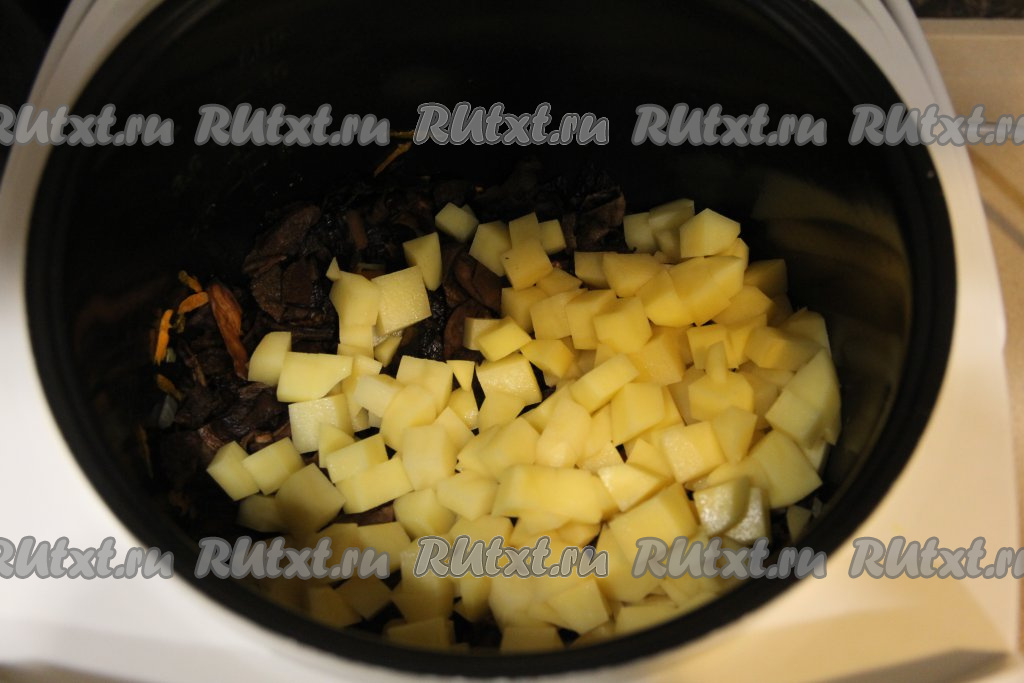 Когда морковка станет достаточно мягкой, выложить в чашу подготовленные грибы, перемешать и обжарить с овощами в течение 5 минут, периодически их перемешивая. Крышку мультиварки закрывать не нужно. Затем добавить картошку, нарезанную на средние кубики.