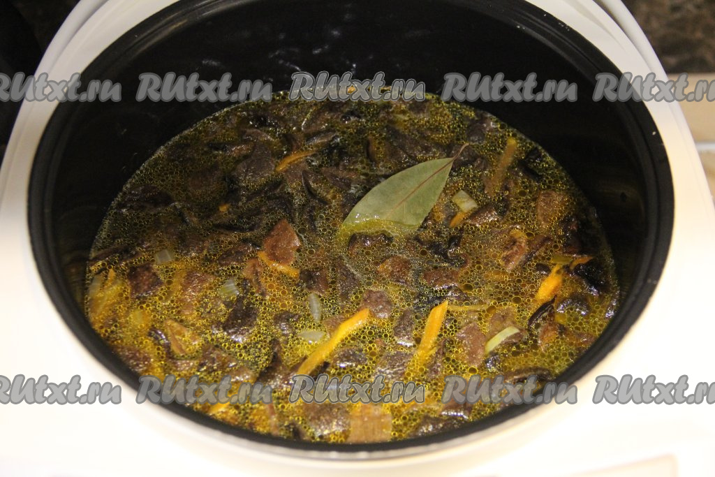 В чашу с грибами и овощами влить 2 литра воды комнатной температуры, перемешать, добавить лавровый лист, посолить. Закрыть крышку мультиварки и выставить режим "Суп" на 40 минут.