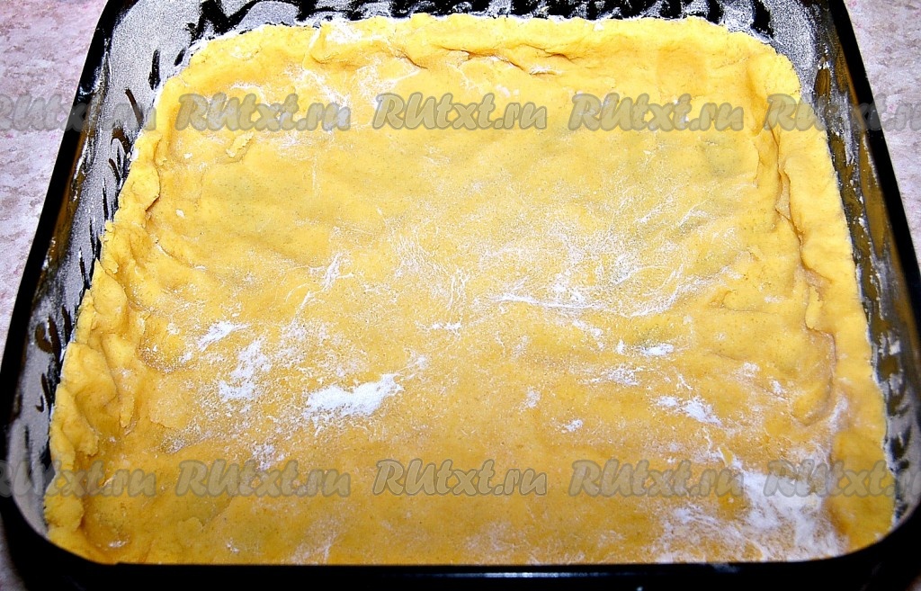 Форму для пирога смазать сливочным маслом (или маргарином) и обсыпать мукой. Остатки муки стряхнуть.