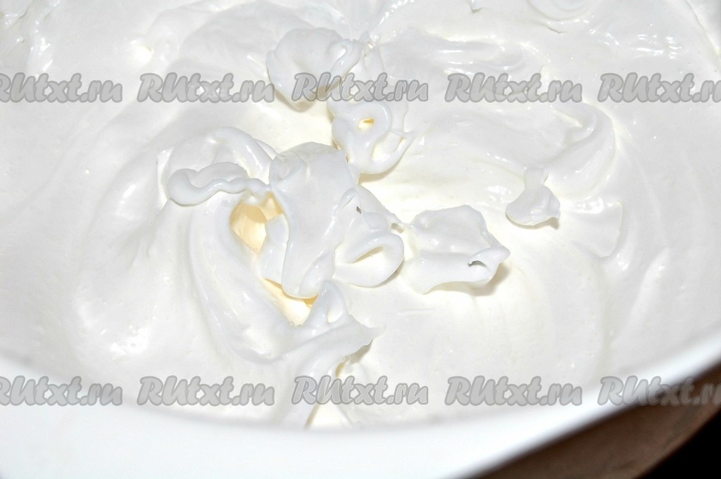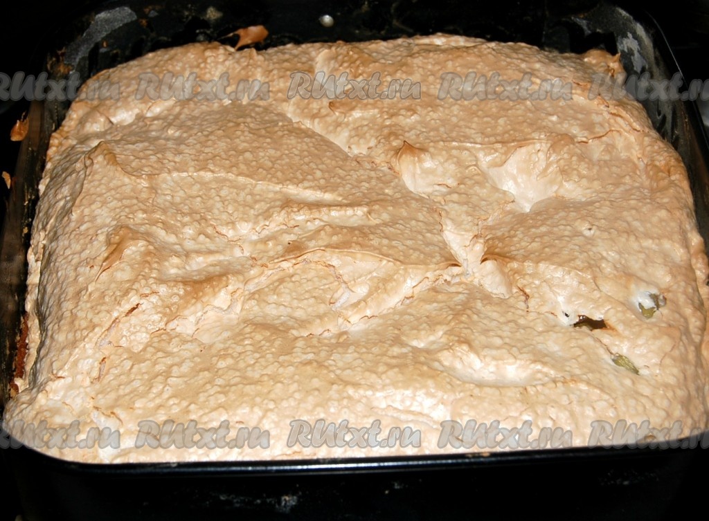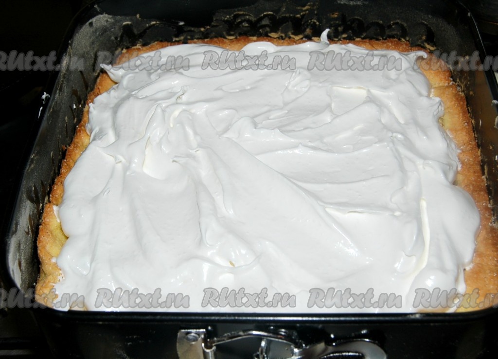 Пока пирог печется можно подготовить верхний слой начинки. Для этого взбить белки с сахаром до состояния плотной пены и выложить полученную белковую массу на пирог.