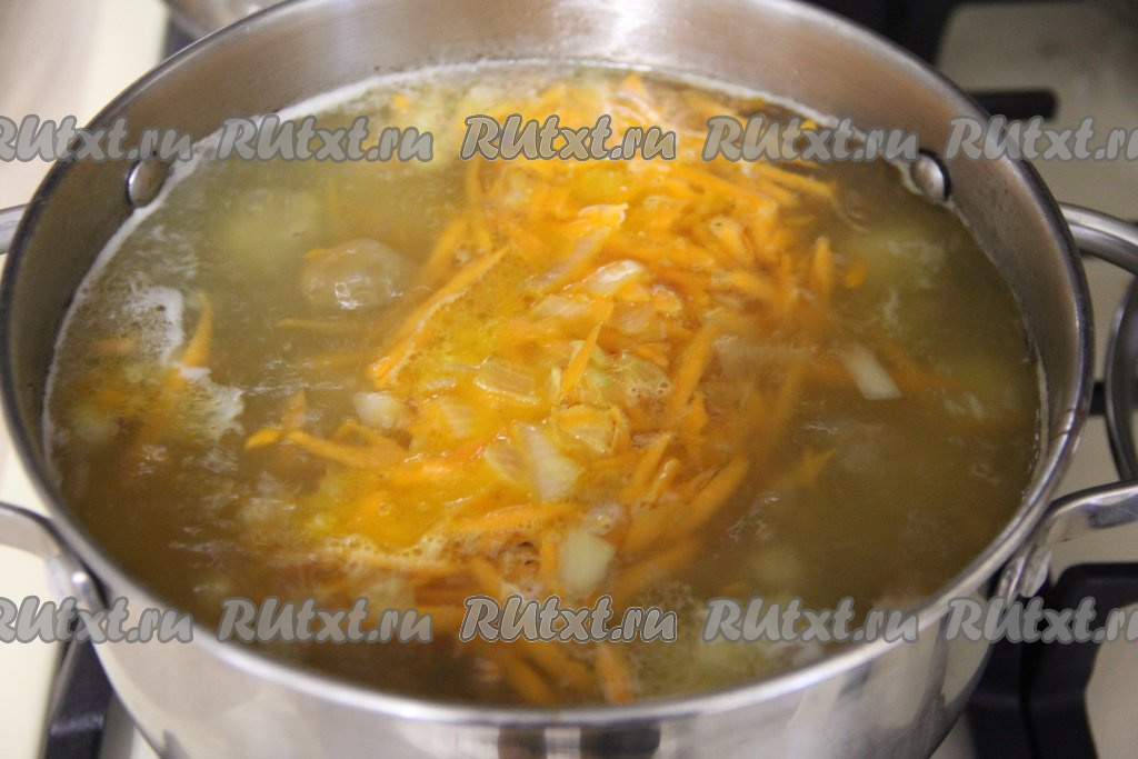 Обжарить лук с морковкой в течение 6-7 минут (до мягкости моркови). Периодически, чтобы овощи не подгорели, их нужно перемешивать. После того как картошка проварится 10-15 минут (станет достаточно мягкой), добавить в кастрюлю обжаренные овощи, варить 3-5 минут.