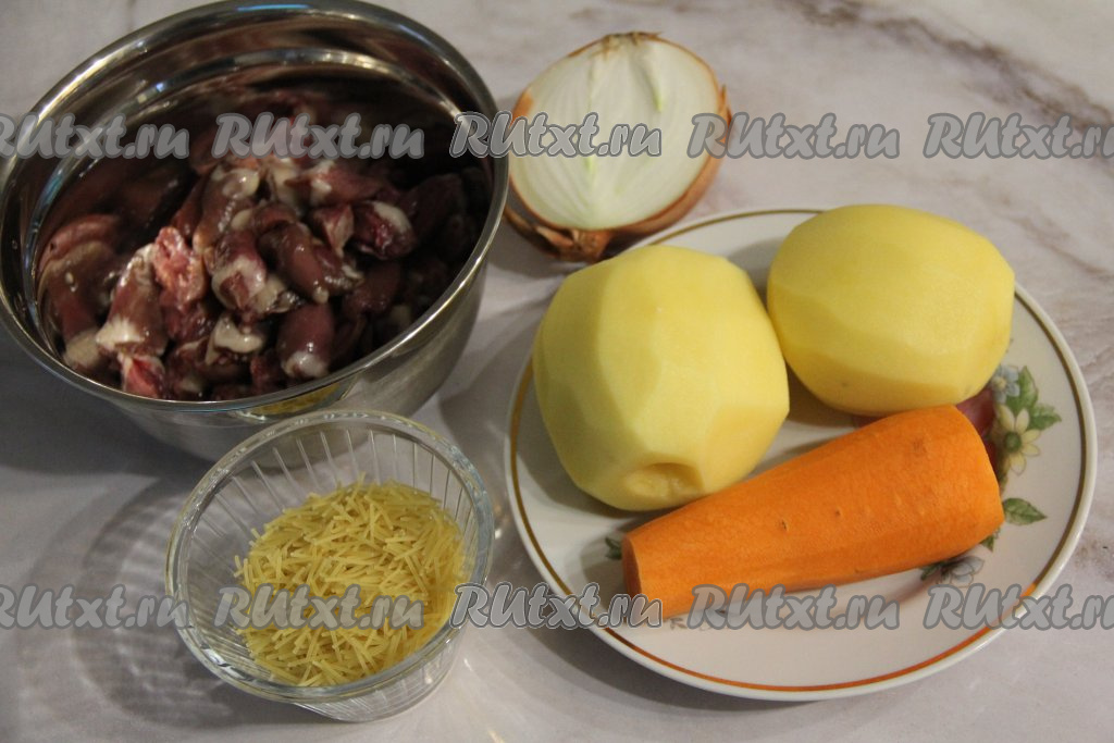 Подготовить продукты. Почистить картошку, морковь и лук. Картофель до тех пор, пока не придёт время добавить его в кастрюлю, полностью залить водой (если не залить очищенную картошку водой, она почернеет). Куриные сердечки разрезать пополам, удалить остатки сосудов и сгустки крови, хорошо промыть водой.