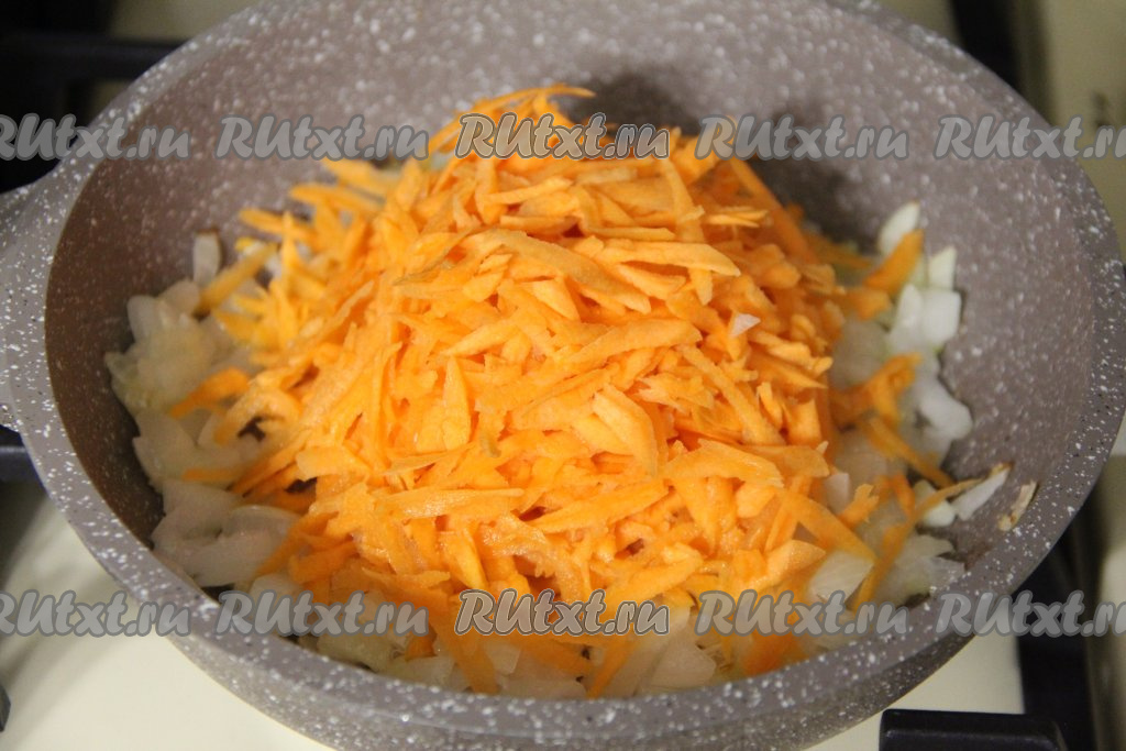 Затем выложить в сковороду морковку, натёртую на крупной тёрке.