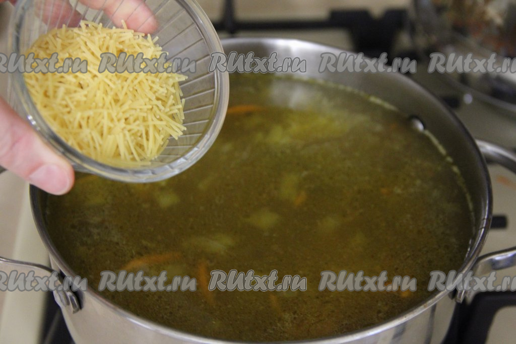 Посолить суп с куриными сердечками по вкусу, дать закипеть, добавить вермишель, перемешать, снова дать закипеть, а после этого проварить на небольшом огне 4-5 минут. Затем убрать с огня и, накрыв кастрюлю крышкой, дать настояться в течение 10 минут.