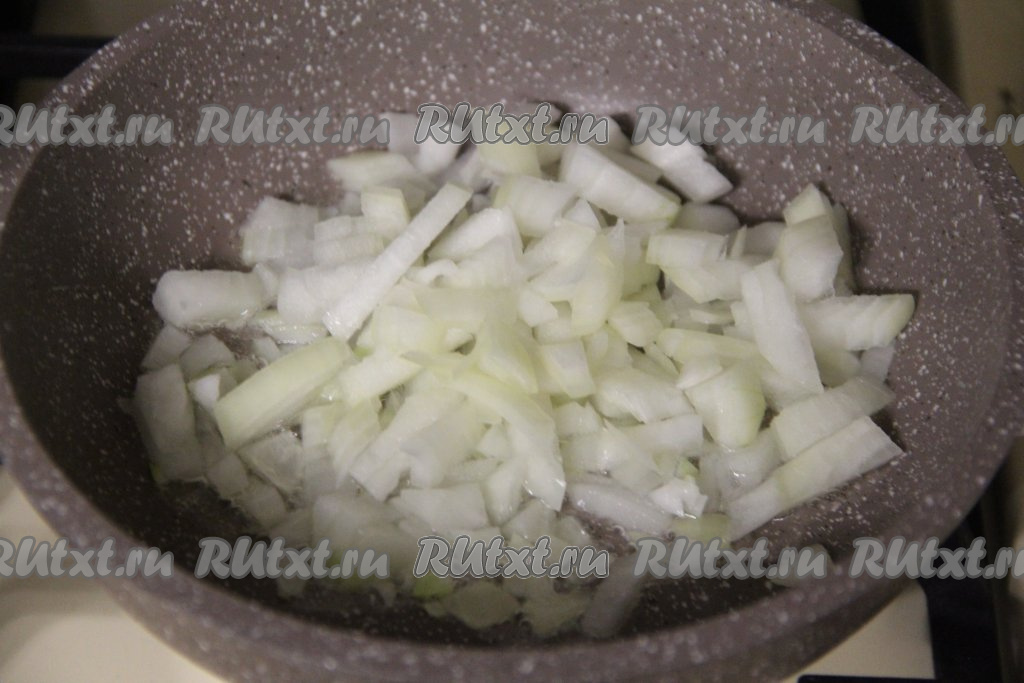 Пока варится картошка, обжарим морковку с луком. Для этого нужно в сковороде хорошо прогреть растительное масло, затем выложить в него мелко нарезанный лук и обжарить его, время от времени помешивая, на среднем огне в течение 5 минут (до прозрачности).