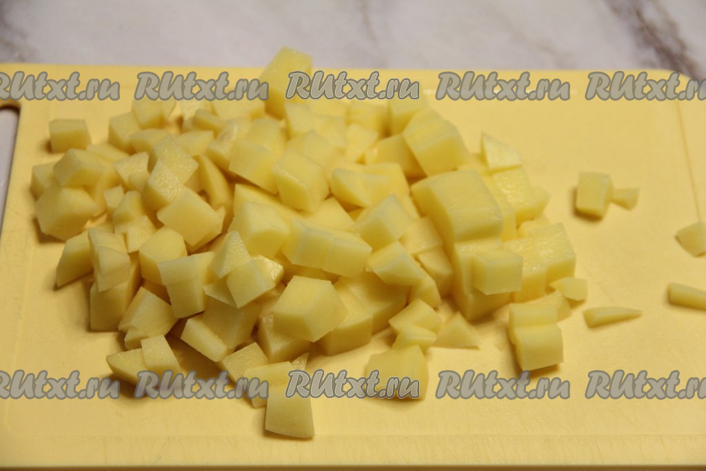 По прошествии 30 минут с момента закипания бульона с сердечками, нарезать картошку на средние кубики.