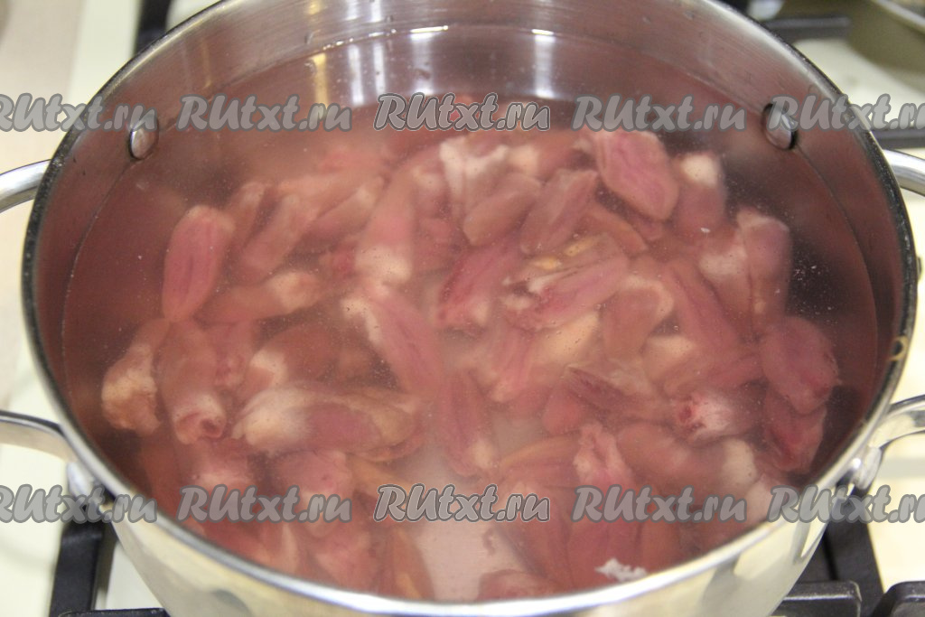 Выложить подготовленные куриные сердечки в кастрюлю, залить 2 литрами воды, поставить на достаточно сильный огонь. После закипания, убрав пену с поверхности бульона, варить куриные сердечки 30 минут на небольшом огне.