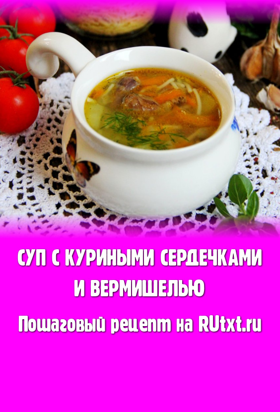 Предлагаю к обеду в кругу семьи приготовить аппетитный, насыщенный суп с вермишелью и куриными сердечками. Бульон, сваренный из сердечек, получается очень вкусным, аппетитным, с золотистым оттенком. Это первое блюдо прекрасно разнообразит меню. При подаче этот куриный суп можно дополнить свежей зеленью и сметаной.