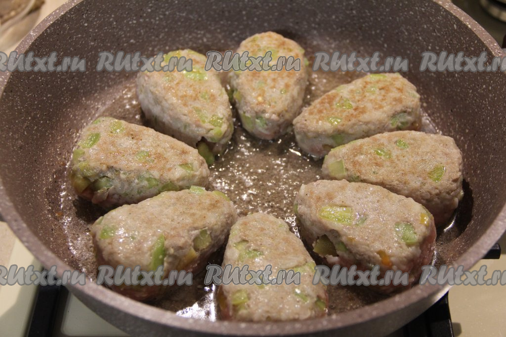 Ленивые перцы, сформированные из фарша с рисом, обжарить на сковороде на среднем огне с двух сторон до золотистого цвета.