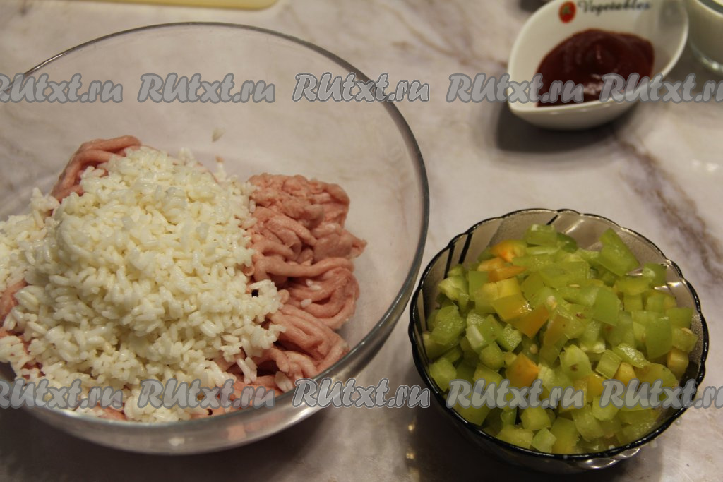 Подготовить продукты. Я использовала покупной свиной фарш, можно взять и домашний фарш, пропустив кусочки мяса через мясорубку. Рис промыть водой, затем выложить его в кастрюлю с закипевшей подсоленной водой, перемешать и варить с момента закипания до готовности риса (минут 20). Затем откинуть варёный рис на сито, оставить остывать.