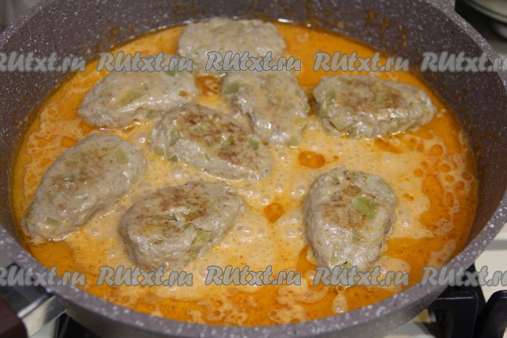 Влить соус в сковороду с ленивыми перцами. Дать томатно-сметанному соусу закипеть, убавить огонь до минимума.