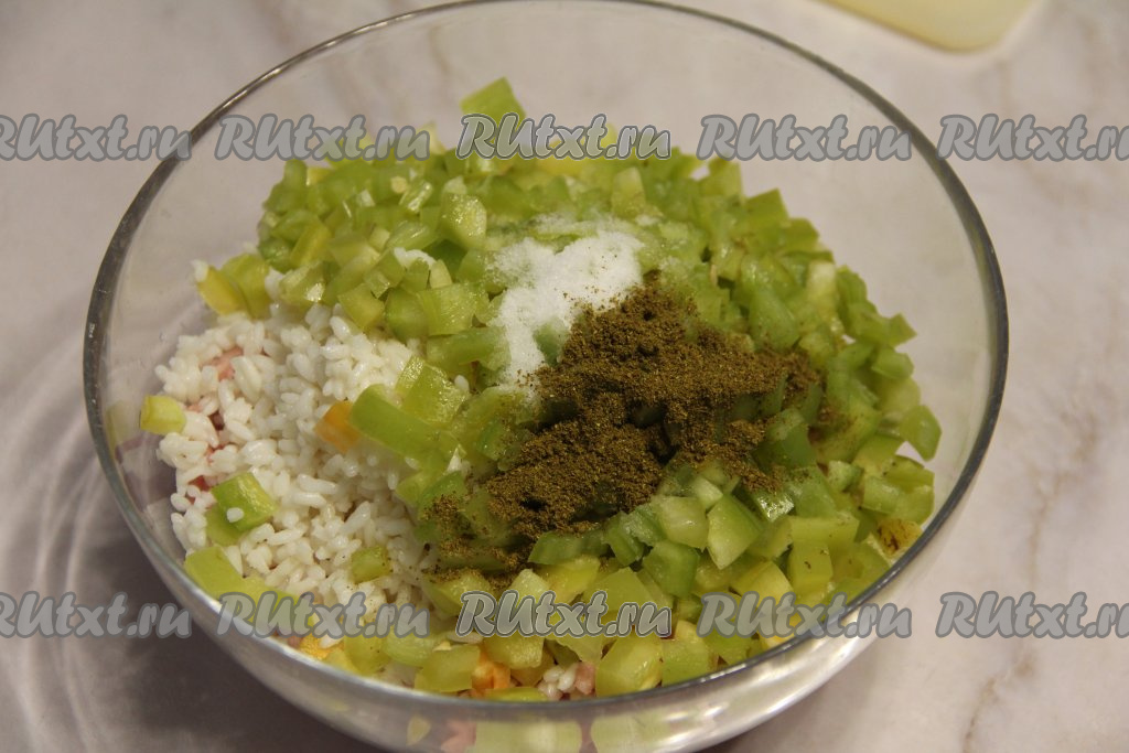 В миску с фаршем и рисом добавить нарезанный перец, соль и любимые специи.